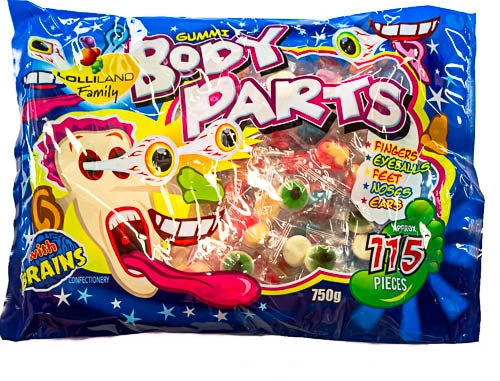 Ingredients: Corn Syrup, Sugar, Water, Gelatine (beef), Humectant (420), Acidity Regulators (330, 296), Artificial flavours, Thickener (440), Vegetable oil, Artificial colours (171, 129, 150d, 133, 110, 102) Glazing agent (903).