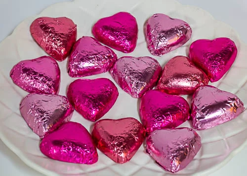 Couverture Fine Milk Chocolate Hearts covered in Coloured Foil