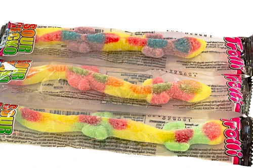 Ingredients: Glucose syrup (corn or wheat), Sugar, Gelatine, Humectant (420), Acid (330, 270, 297, 333), Gelling Agent – Agar, Flavours, Colours (129, 102, 133, 110, 171).